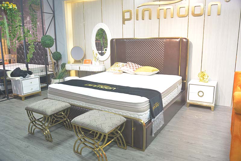 Pinmoon is our branch brand logo for mattress products. There are there parts consist of headboard design, golden stainlees steel